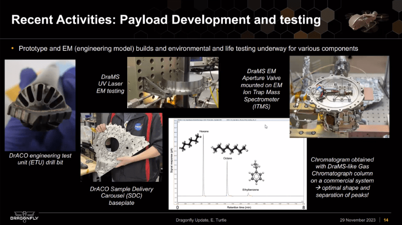 Several elements of the mission’s design are incredibly novel, necessitating new and innovative approaches to problems. Cruise is one of the first areas where the team has been forced to innovate, relying on a novel power tap from the mission’s Multi-Mission Radioisotope Thermoelectric Generator. Thermal management is also a concern during cruise, as the radioactive MMRTG will need active temperature control to ensure that the spacecraft remains healthy Once at Titan, the mission will involve a lengthy entry, descent, and landing (EDL) sequence on Titan, leveraging the moon’s dense atmosphere and lower gravity. The nearly 105-minute EDL sequence will see the spacecraft enter using a large heat shield, similar to the flown systems onboard the Genesis and OSIRIS-REx spacecraft. Following peak heating and deceleration, the system will deploy a series of parachutes to help slow the spacecraft to subsonic speeds over the course of more than an hour, before the ultimate test of the rotocraft’s systems can begin. Dragonfly’s first flight will be a trial by fire, with the EDL system releasing the rotorcraft to perform its first autonomous powered flight to a safe landing zone. This approach, while radical in terms of traditional EDL sequences, enables a full checkout of the design in flight conditions, something that is nearly impossible to replicate on Earth.
