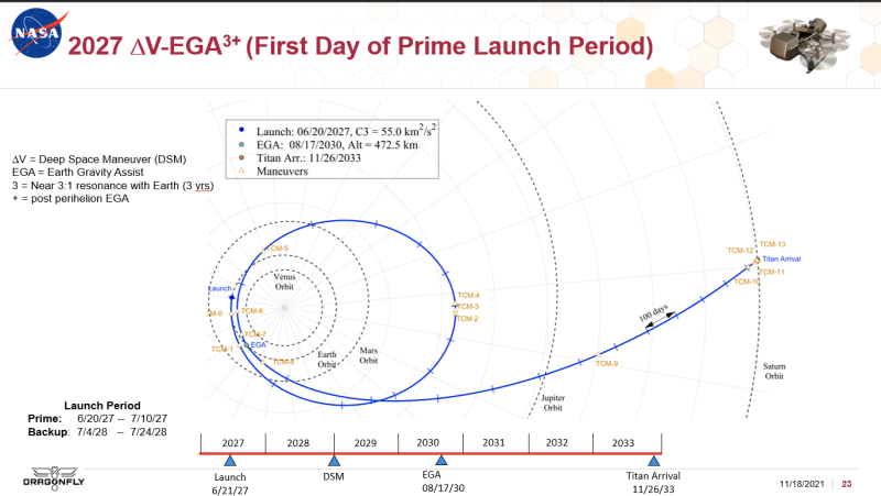 The Dragonfly mission is currently set to launch in June 2028 on a launch vehicle comparable to a Vulcan VC2, with its arrival at Titan planned for 2034. Initially planned for launch in 2026, and later 2027, the mission has slipped due to several constraints in design and funding. The rotorcraft will fly to dozens of promising locations on Titan looking for prebiotic chemical processes common on both Titan and Earth. Dragonfly’s historic mission to Titan will be the first time NASA will fly a multirotor vehicle for science on another world. Differing from past designs, the spacecraft utilizes eight rotors and flies like a large drone as opposed to the helicopter-like Ingenuity on Mars. It will take advantage of Titan’s dense atmosphere – four times denser than Earth’s – to become the first vehicle ever to fly its entire science payload to new places for repeatable and targeted access to surface materials, revolutionizing the understanding of a planetary body. This builds on the legacy of successful mobile science platforms such as rovers, which have championed planetary science for decades.